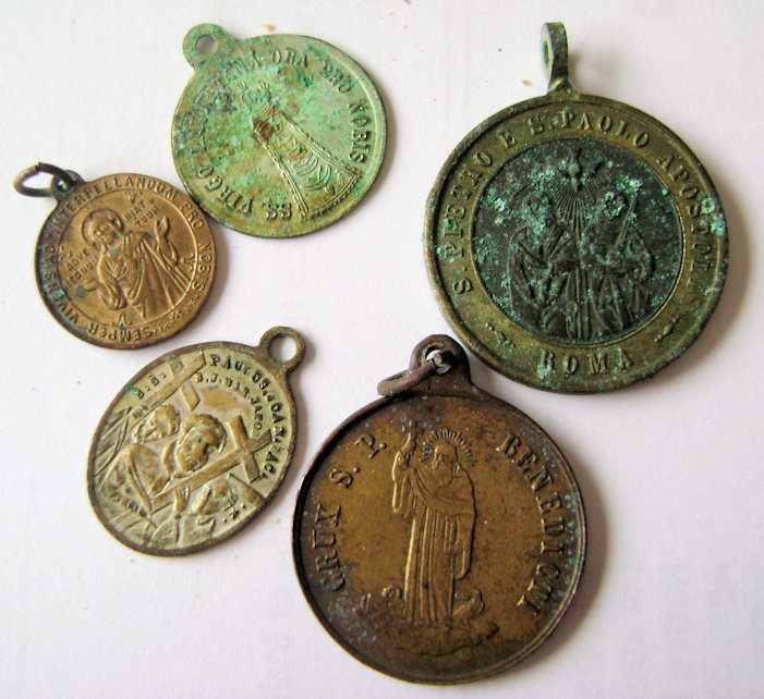 Médailles découvertes dans la chapelle du Médic en 2013 : St Paul, le Christ, la Vierge, St Benoît… (Photo : DR)