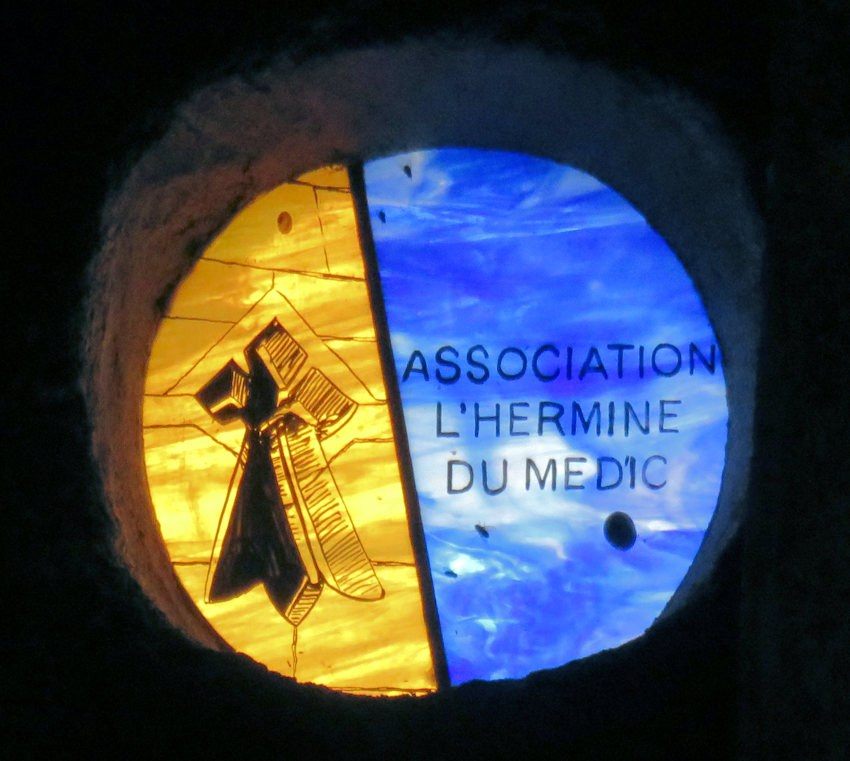 Oculus inséré dans le mur Ouest avec son vitrail en mémoire de l’association l’Hermine du Médic