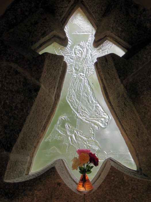 Fenêtre en forme d’hermine, avec vitrail thermoformé représentant l’Archange Saint Michel