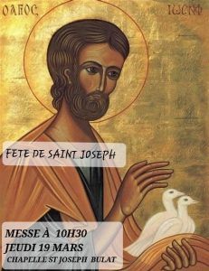 • Jeudi 19 mars, 10h 30, Chapelle St Joseph à BULAT-PESTIVIEN, fête de saint Joseph, messe pour : Jocelyne Charles, Hélène Capitaine, Jeanne Chambry, Monique Person.